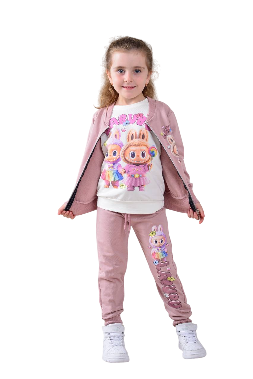 Детски комплект за момиче с дълъг ръкав 3 части лека вата, цвят пудра
